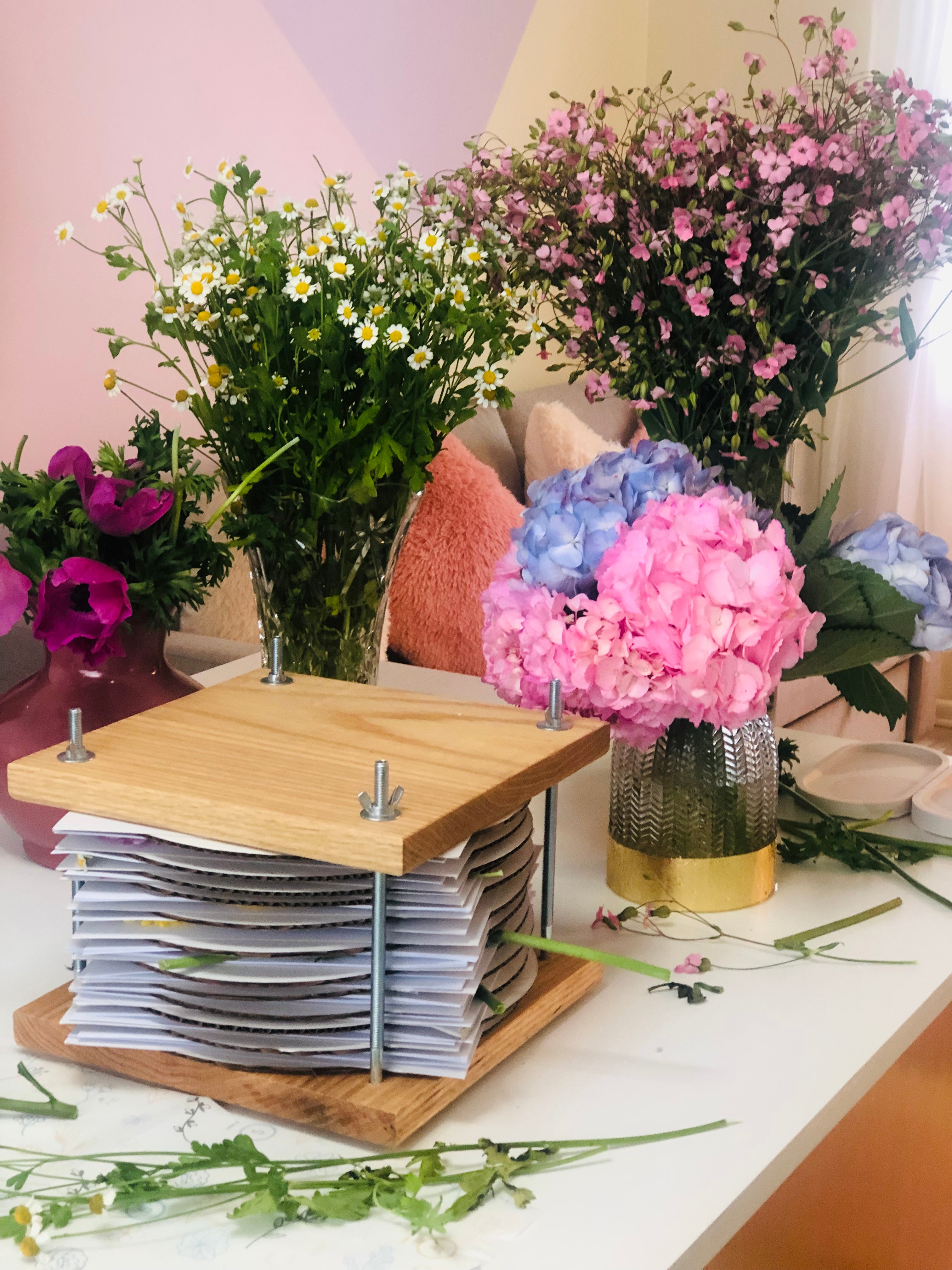Using traditional hand-pressing techniques, we carefully layer each petal and stem between sheets of absorbent paper. This process is entirely manual, no shortcuts, just time, patience, and a deep respect for the flower’s natural shape. Over days and sometimes weeks, the blooms slowly dry under pressure, retaining their intricate details and rich pigments.